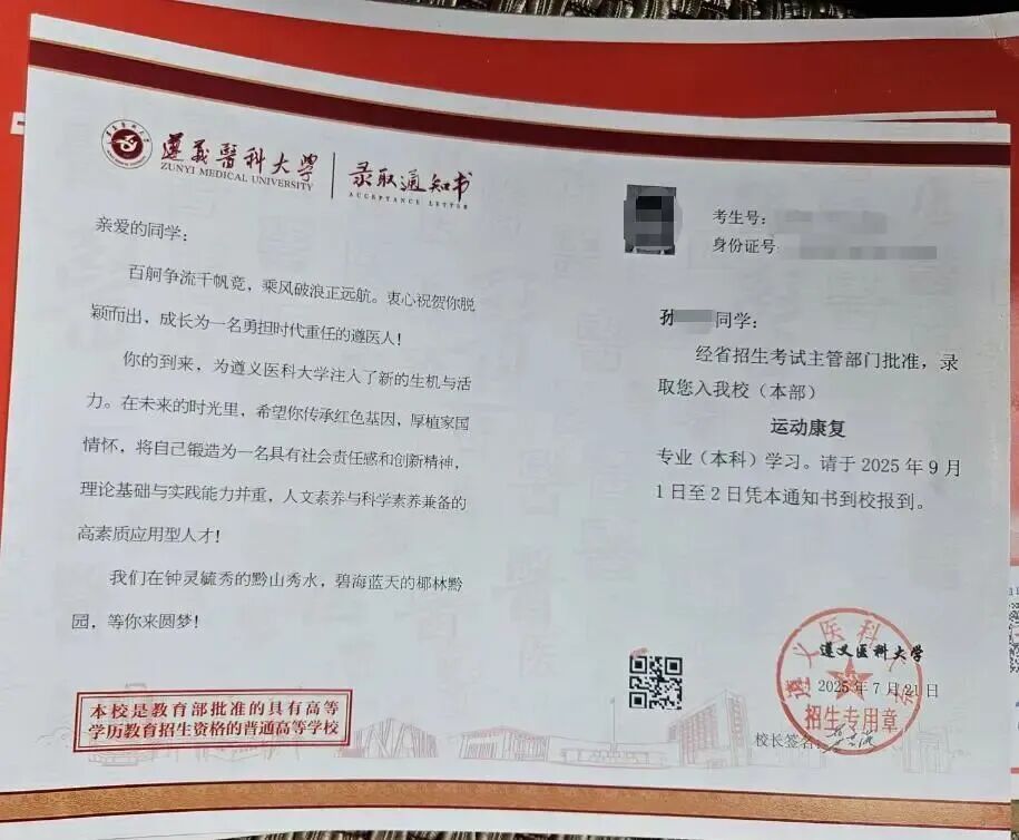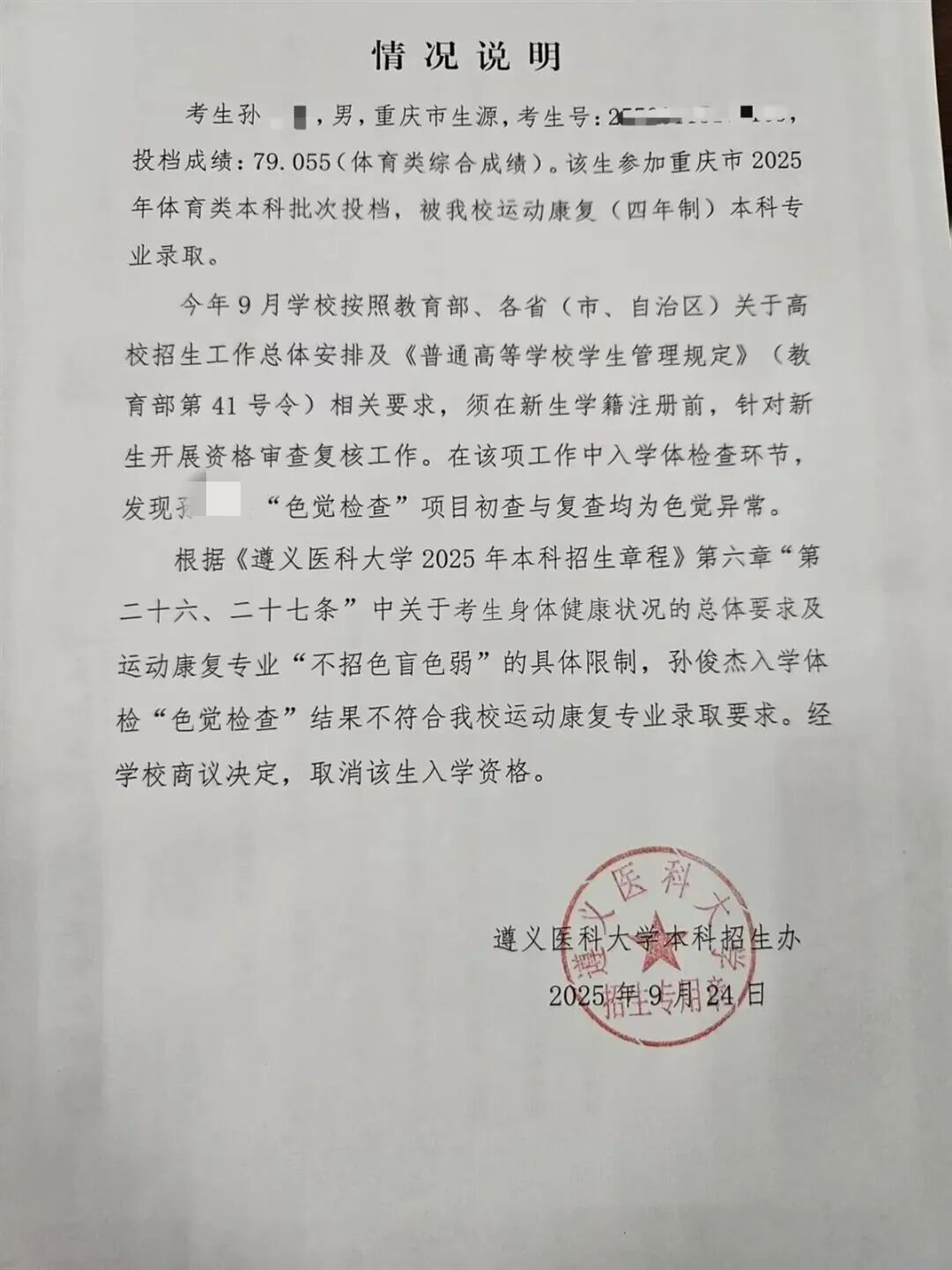 据媒体报道,重庆合川区18岁的孙同学参加了2025年高考,被录取到贵州遵义医科大学运动康复专业。孙同学高考时体检眼科项目无色弱,但医生意见是“合格受限”。入学后学校组织复检,查出色弱,学校根据规定,取消该生入学资格。