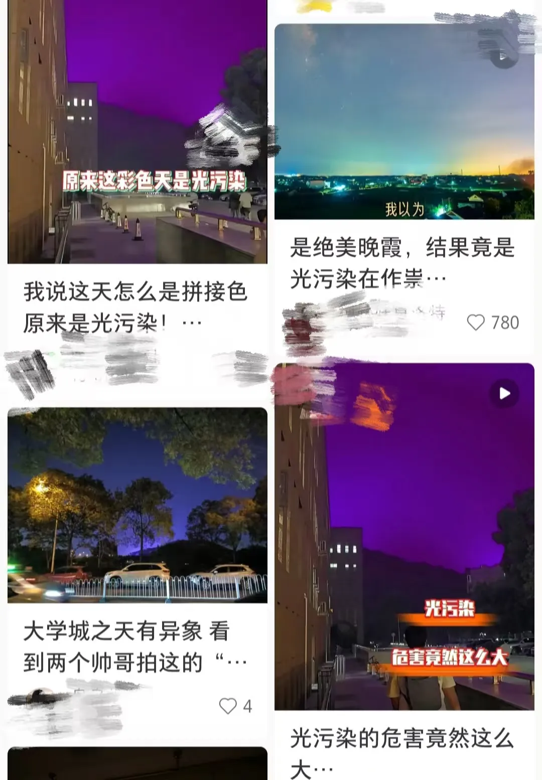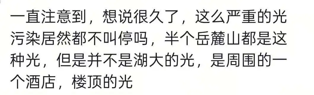 经检索,此前一段时间已有网友对上述几处区域光线情况有过疑问,询问是否存在光污染,近期,网上也有一定数量的自媒体账号发布相关内容认为,长沙部分区域强光现象属于光污染,且会对周边生物造成影响。
