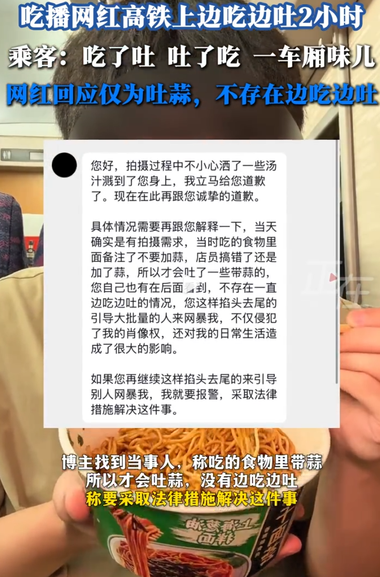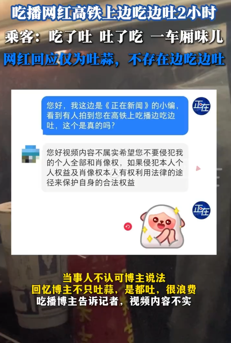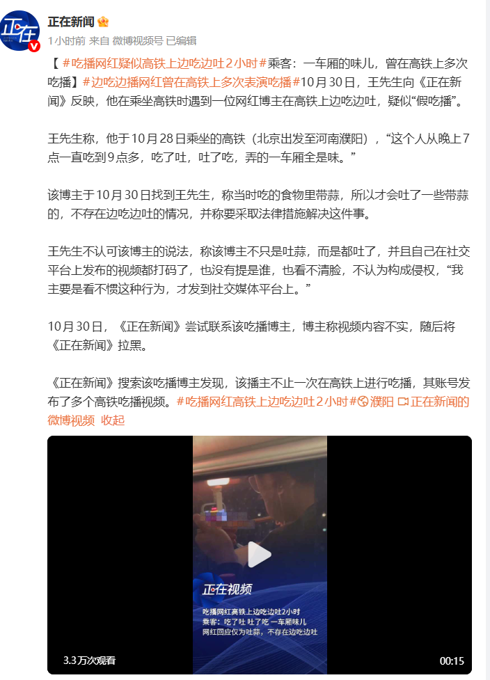 10月30日,王先生向《正在新闻》反映,他在乘坐高铁时遇到一位网红博主在高铁上边吃边吐,疑似“假吃播”。