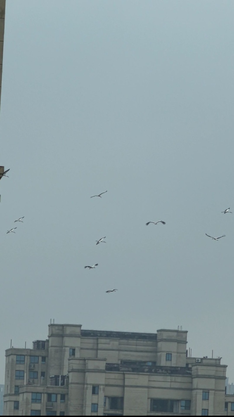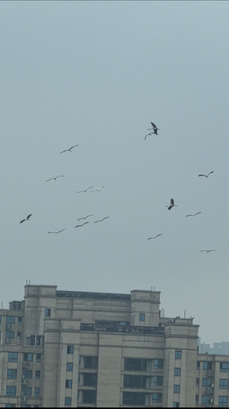 图为多只东方白鹳出现在智慧公馆小区附近上空