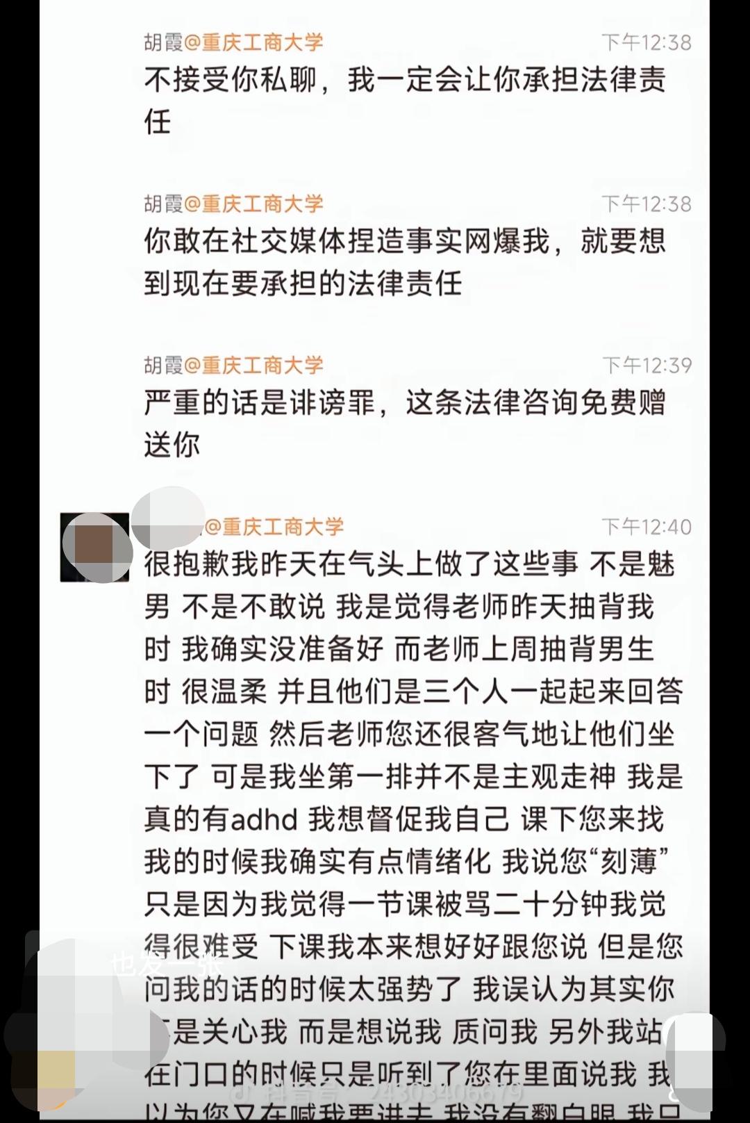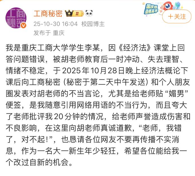 10月30日16时4分,该账号发布了一则道歉帖文。帖文中涉事学生李某称,因《经济法》课堂上回答问题错误,被胡老师教育后一时冲动、失去理智、情绪不稳定,10月28日晚上向“工商秘密”和个人朋友圈发表了对胡老师的不当言论,并夸大相关情况,“在这里向胡老师真诚道歉,作为一名大一新生年少轻狂,希望各位能给我改过自新的机会。”