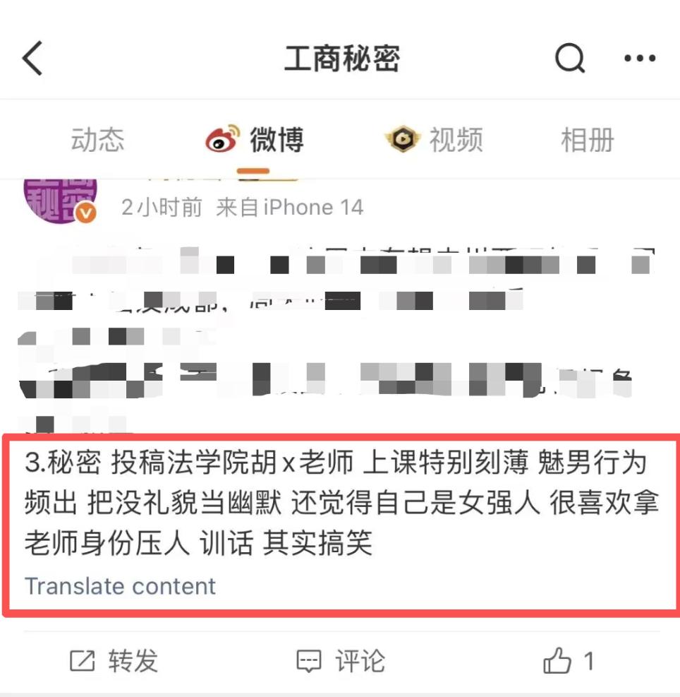 近日,重庆工商大学一位女学生在微博账号“工商秘密”投稿,称法学院的胡老师“刻薄、媚男”,该事件引发关注。