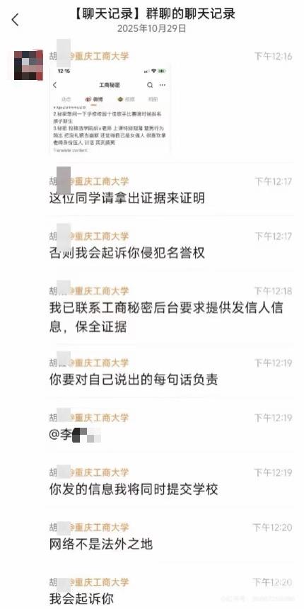 据该课程的群聊消息显示,胡老师在群聊中表示,请这位投稿的学生拿出证据来证明,如无法证明投稿中的信息,或涉嫌侵犯名誉权,老师称将会起诉。
