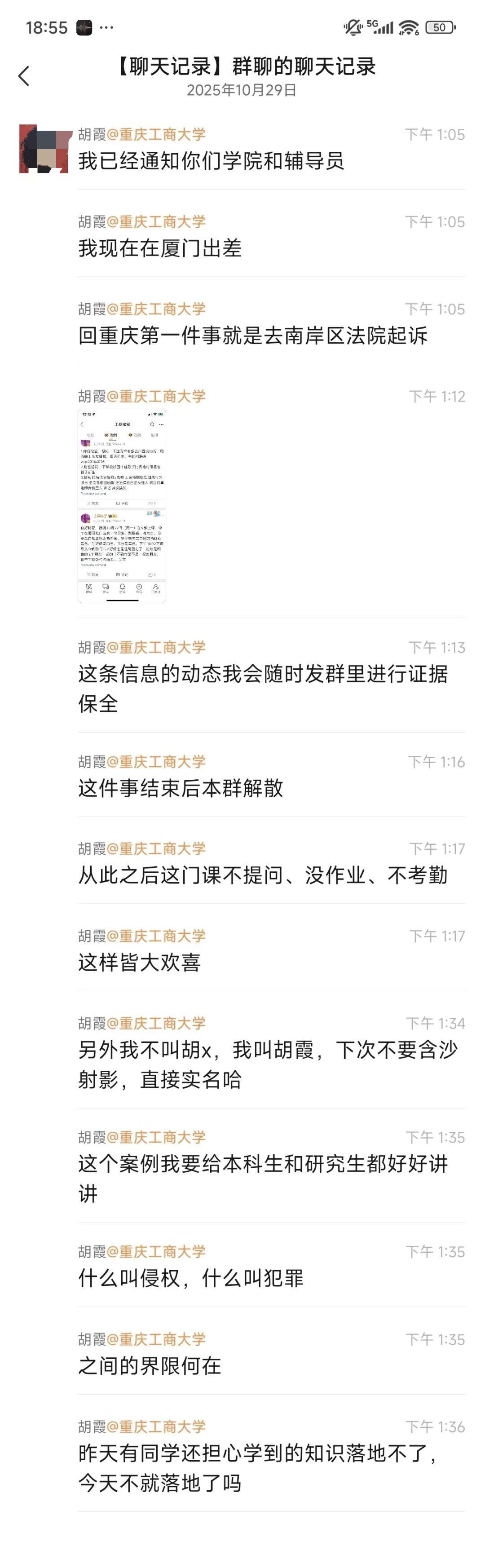 胡老师在聊天中表示,要把这个事情作为案例讲给本科生和研究生,涉及法学专业知识中的“侵权”和“犯罪”,二者的界限何在,并表示还有学生担心所学的知识无法落地,就用这种方式落地。