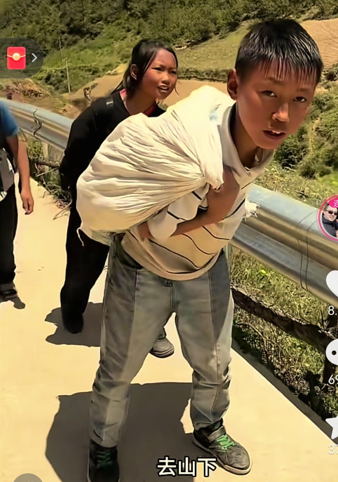 视频开头,两名男孩和一名女孩正在马路中间捡拾从山坡上滚落的石头,其中一名男孩背上还扛着一袋重物。三名孩子说,他们放假回家帮奶奶干活,马上上学要下山去舅舅家,袋子里的是土豆,要背到舅舅家吃。当视频拍摄者问及家里人在哪儿时,其中一个孩子回答道:“爸爸妈妈都去世了,所以舅舅养着我们,住在他们家。”视频中,三个孩子中的老大因为考试得了第一,舅舅花七百元给他买了一辆自行车作为奖励。由于舅舅家还有两个儿子,人口多房子小住不下,舅舅特意在自家附近给他们兄妹三人单独租了一间房。平时舅舅还会给他们零花钱。