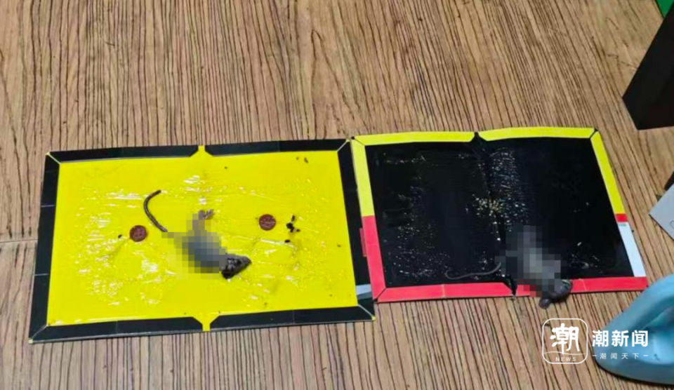 毛大伯的家在2楼。10月31日上午,记者来到毛大伯家,进门就看见客厅地面上并排放的两个粘鼠板上,各粘着一只小老鼠。