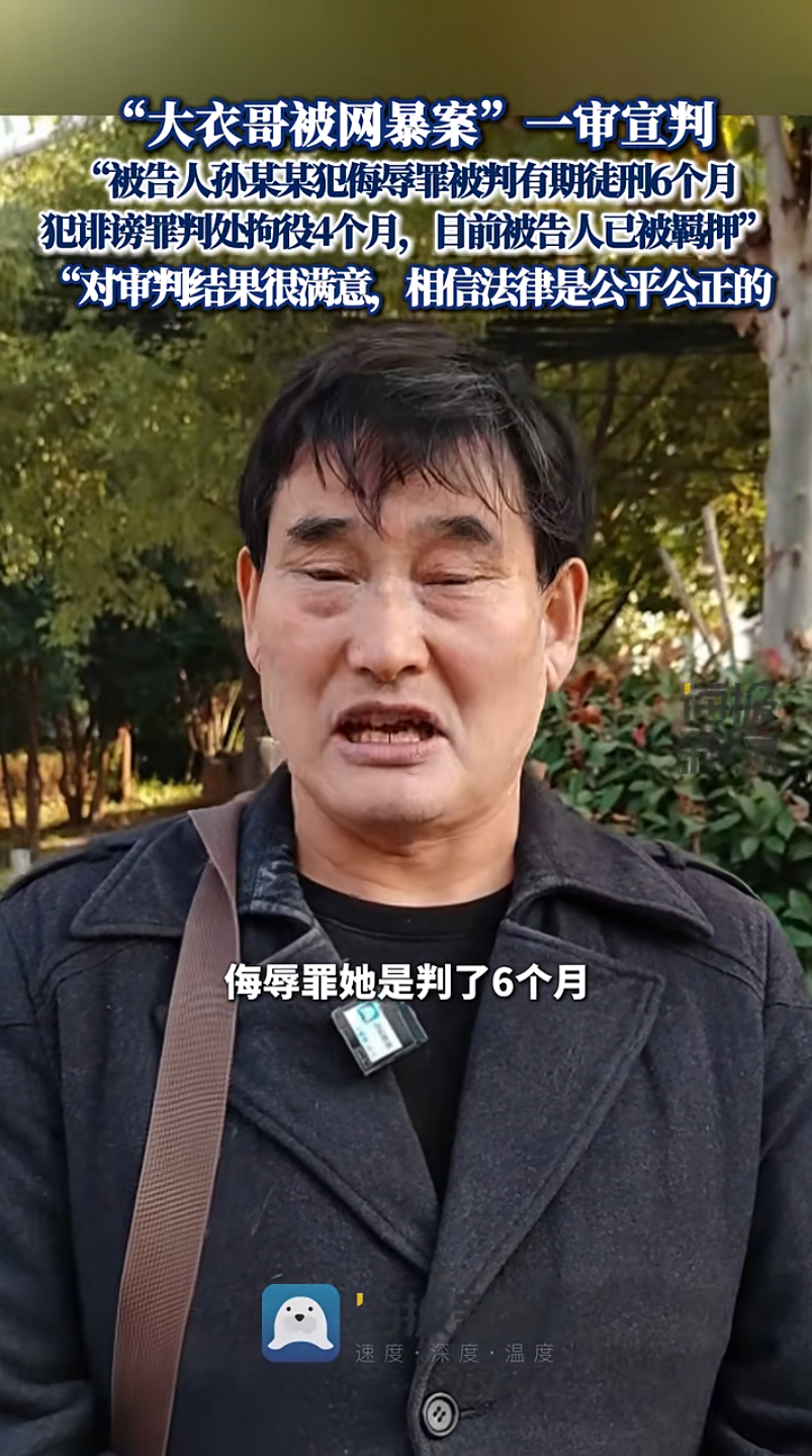 11月1日,“大衣哥”被女子网暴4年案一审宣判。“大衣哥”代理律师杨安明告诉红星新闻记者,“法院都支持了我们当时的请求。”法院宣判,被告人孙某某犯侮辱罪判处有期徒刑6个月,犯诽谤罪判处拘役4个月,两罪合并执行有期徒刑6个月。