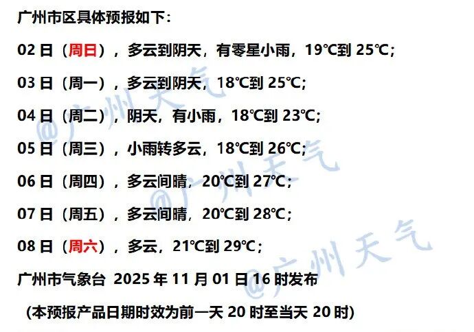 11月2日,粤北和珠三角大部市县多云到阴天,有零星小雨,其余市县多云间阴天局部有小雨。最低气温:粤西、粤东和珠江三角洲市县19~22℃,其余市县15~18℃。
