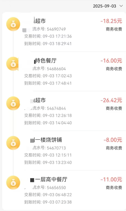 今天,杭州一位高一学生家长和橙柿记者吐槽,孩子上高中以来,自己只能通过饭卡记录去了解孩子的动态。但最近孩子的饭卡花销让她有些吃惊,她说:“每天除了中饭和晚饭两顿正餐,学校的西点吧、小卖部都是必打卡的,多的时候一天就有五六笔消费记录。我问了身边的朋友,没有一个是高于我们的。”