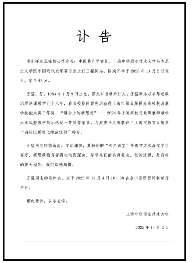 上海中侨职业技术大学发布讣告称,中国共产党党员、上海中侨职业技术大学马克思主义学院中国近代史纲要专业主任王猛同志,因病不幸于2025年11月2日逝世,享年42岁。