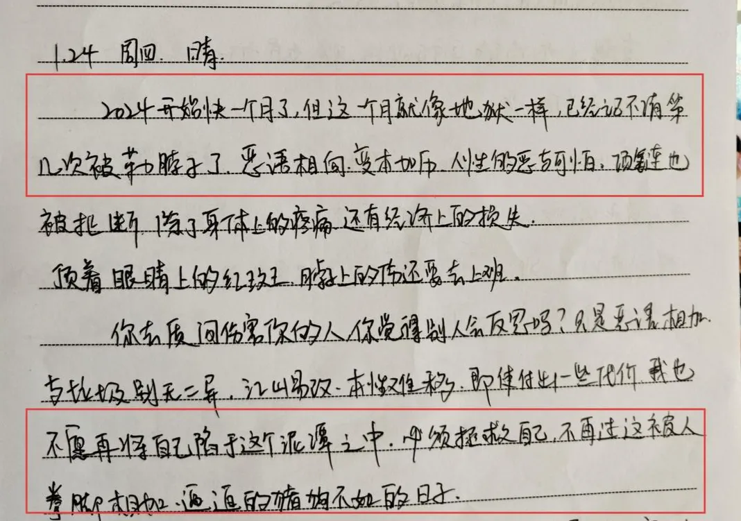 11月2日,红星新闻记者获取了该日记部分内容。2024年1月3日:“身体和心灵遭受了巨大的创伤一次又一次……被人威胁被人拿刀架在脖子上”;2024年1月24日:“这一个月就像地狱一样,已经记不清第几次被勒脖子了。恶语相向,变本加厉,人心的恶与可怕,项链也被扯断……”