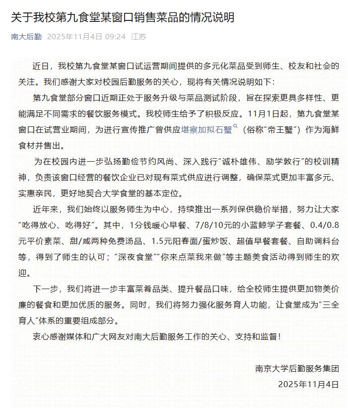 学校食堂卖帝王蟹引发关注 南京大学:已对现有菜式进行调整