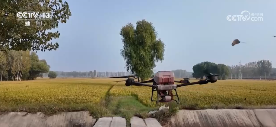 在河南新乡原阳县的稻田里,植保无人机正低空飞行在稻田里,均匀撒下冬小麦的种子。