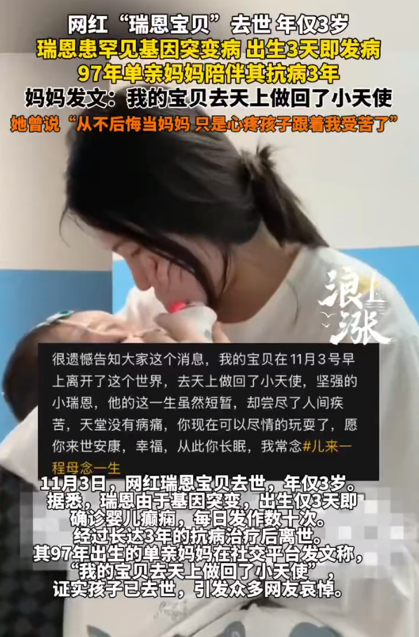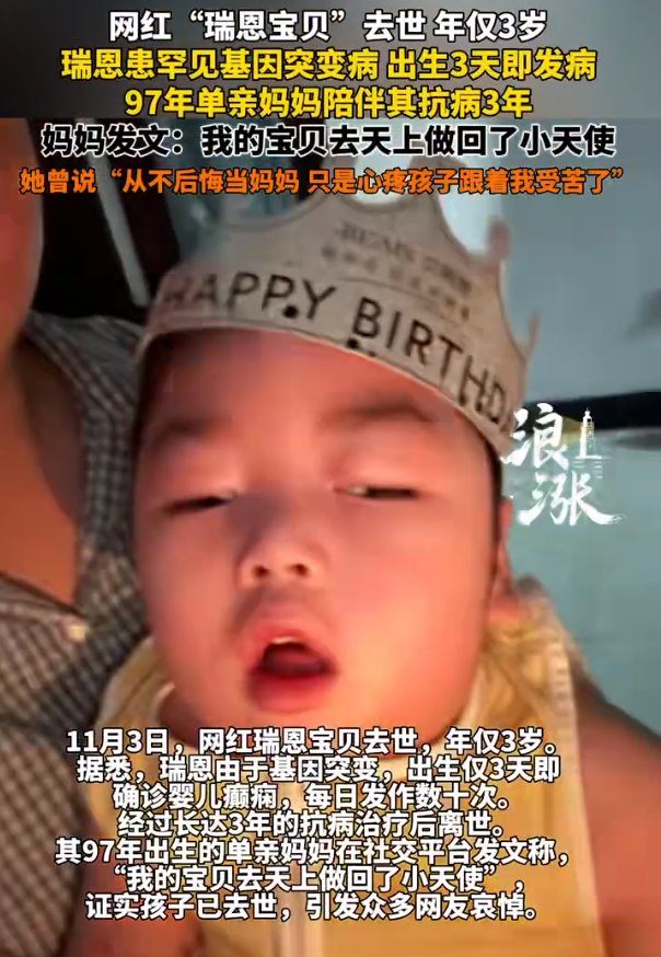 11月3日,网红“瑞恩宝贝”去世,年仅3岁。据悉,瑞恩由于基因突变,出生仅3天即确诊婴儿癫痫,每日发作数十次。经过长达3年的抗病治疗后离世。其97年出生的单亲妈妈在社交平台发文称,“我的宝贝去天上做回了小天使”证实孩子已去世,引发众多网友哀悼。