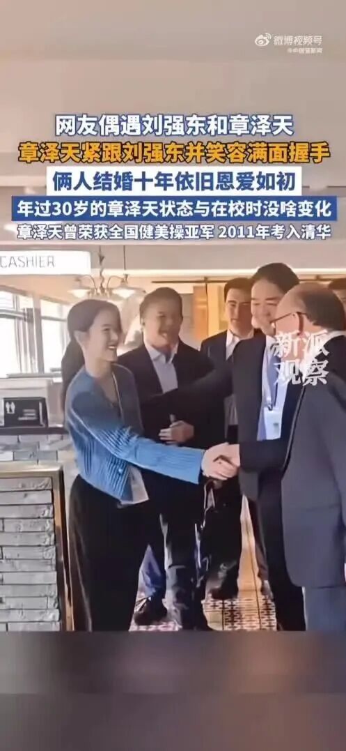 近日,有网友偶遇刘强东章泽天,章泽天紧跟刘强东笑容满面握手。