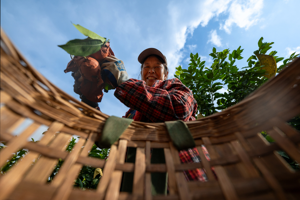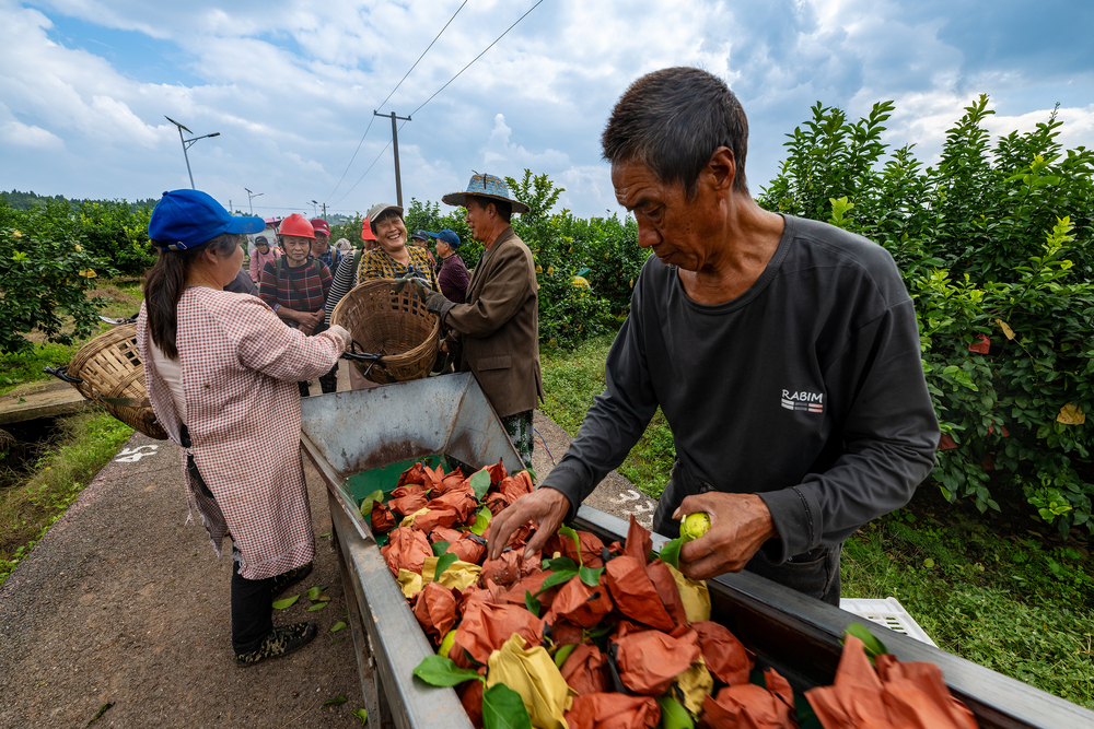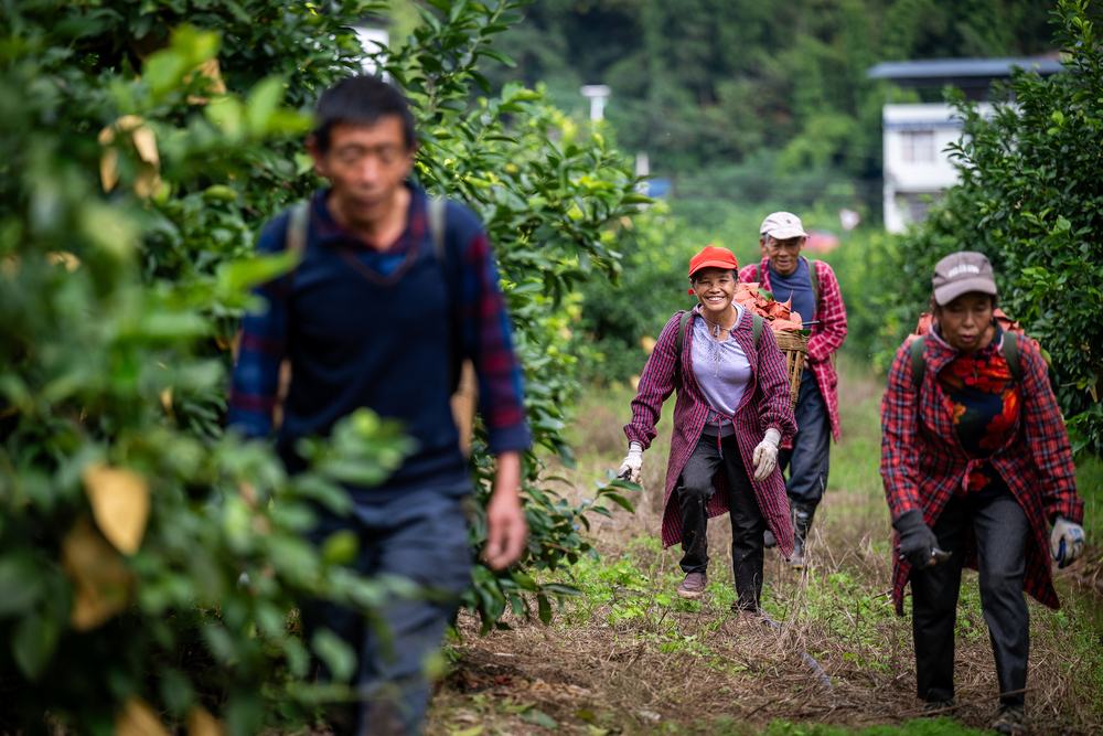 ▲2025年11月4日,潼南区柏梓镇羊堡村,农民们将采收的柠檬背出果园,脸上充满笑容。记者张春晓摄