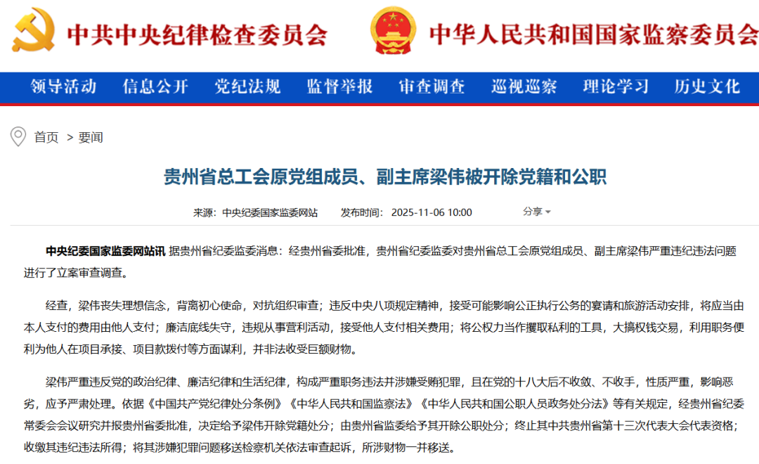 11月6日,据中央纪委国家监委网站消息:经贵州省委批准,贵州省纪委监委对贵州省总工会原党组成员、副主席梁伟严重违纪违法问题进行了立案审查调查。