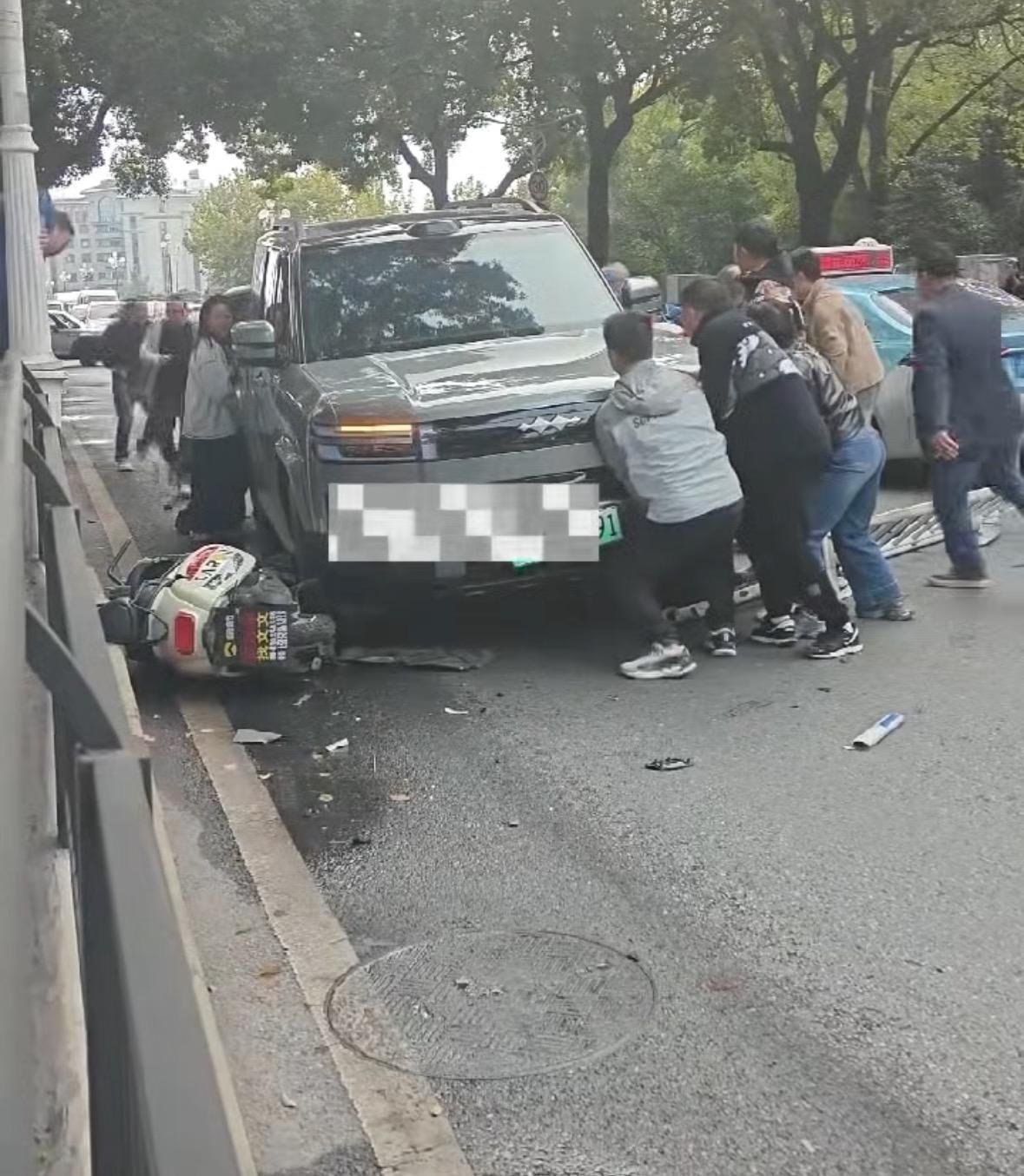 另有多段视频显示,有交警和路人合力抬起越野车,将电动车驾驶者救出。