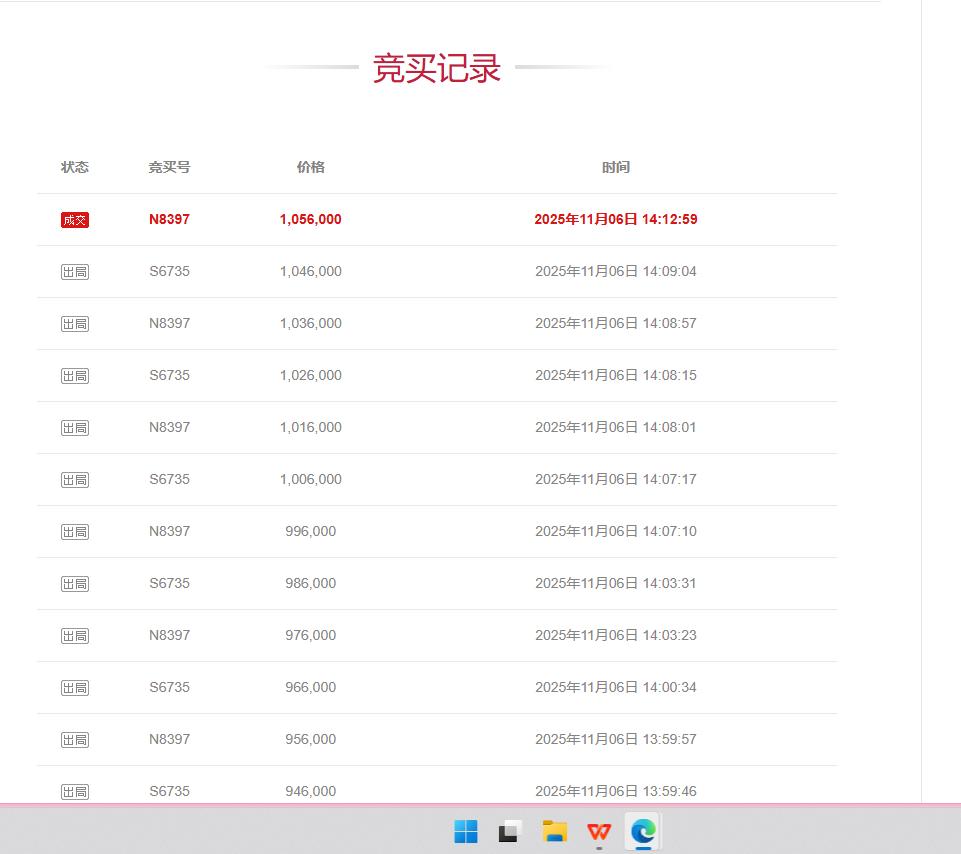 这期间,一共经历了40轮出价。其中,竞买号为E3541的竞买人率先以26.6万出价,很快被超过后,又以31.6万再次出价,同样很快被超过。66.6万、68.6万、88.6万……一路上涨。