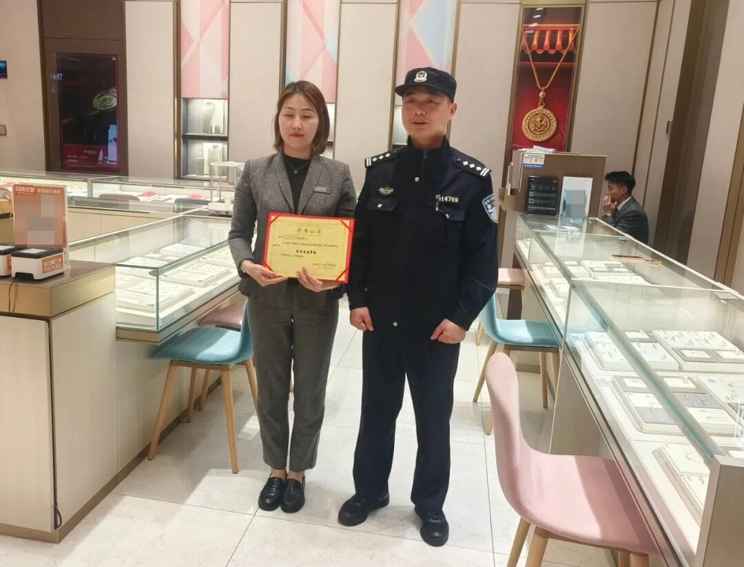 辖区黄金店铺及时向公安机关报告大额购金情况,派出所民警日常强化防控指导,两次到场劝阻并科学布控,保住了群众的上百万投资款。11月3日下午,社区民警陈民为黄金店铺送奖,再次发动其他金融单位和商铺扎紧篱笆,积极发挥反诈劝阻作用。