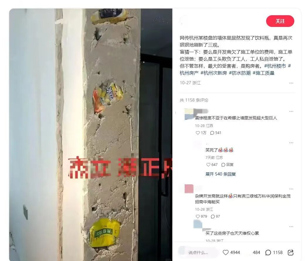 对于相关情况,上城区住房和城市建设局回复:经核实,网传视频中的墙体为卫生间分隔墙,不涉及建筑主体结构。问题系施工人员在填充门套缝隙时,使用饮料瓶作临时支撑且未及时清除,违反施工工艺。区质安站委托杭州市建筑工程质量检测中心现场踏勘,确认该部位为非承重墙,不影响结构安全。