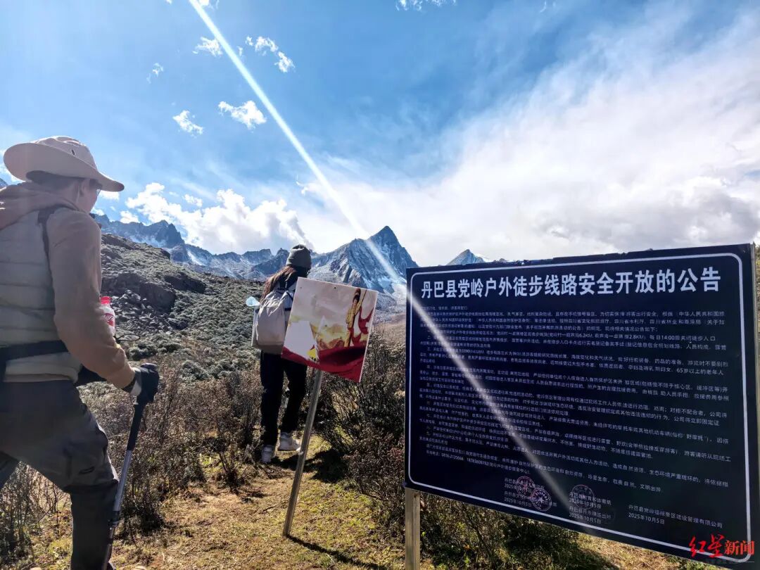 ▲游客从丹巴县党岭户外徒步线路相关公告旁经过