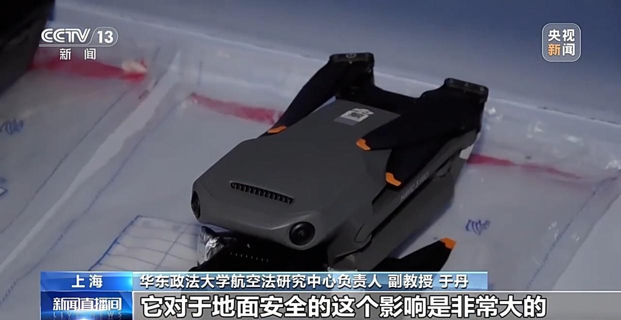 华东政法大学航空法研究中心负责人、副教授 于丹:无人机,大家首先要明白,它是一种航空器,飞行于这个我们城市的上空,郊区的上空,那么下面是有人财物的,所以如果飞行不当,导致这个无人机坠毁,它对于地面安全的这个影响是非常大的。还有我们现在城市里边也有机场,也有一些国家重要的安全的设施,那么如果飞行不当,比如说这个无人机碰到了电网上,那么可能会造成整个城市的电力系统的瘫痪。
