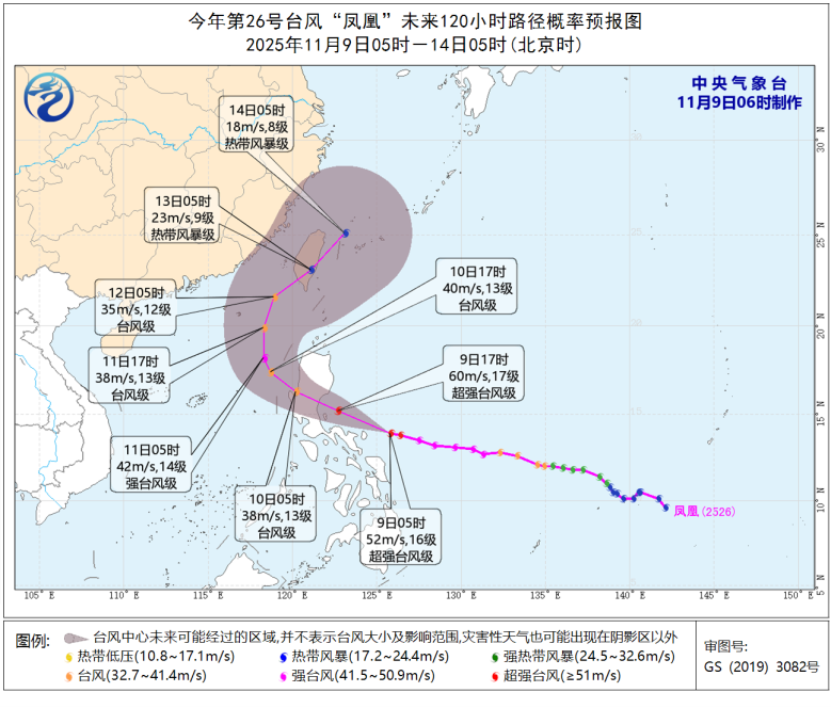 预计,11月9日08时至10日08时,内蒙古中东部、东北地区、西藏西部和北部、青海西南部等地的部分地区将有5至6级风,阵风7至8级。渤海、渤海海峡、黄海北部海域、东海南部海域、台湾海峡、巴士海峡、台湾以东洋面、南海东部海域将有7至8级、阵风9级的大风,其中南海东北部和中东部的部分海域风力可达9至10级、阵风11级,台风“凤凰”中心经过的附近海域风力有11至13级,阵风14至15级。中央气象台11月9日06时发布大风黄色预警。