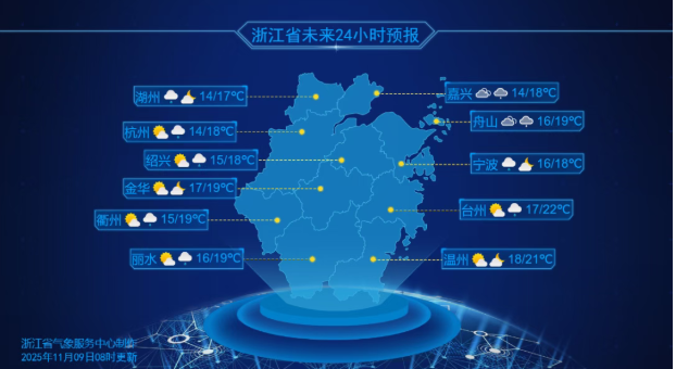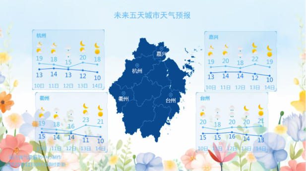 气温方面,浙江最高气温总体保持在16-22℃之间,需要注意的是,天气转好后,早晚凉意愈发明显,部分地区的最低气温仅为10℃。16-18日可能还有一股较强冷空气来袭,公众需及时添衣保暖防感冒。