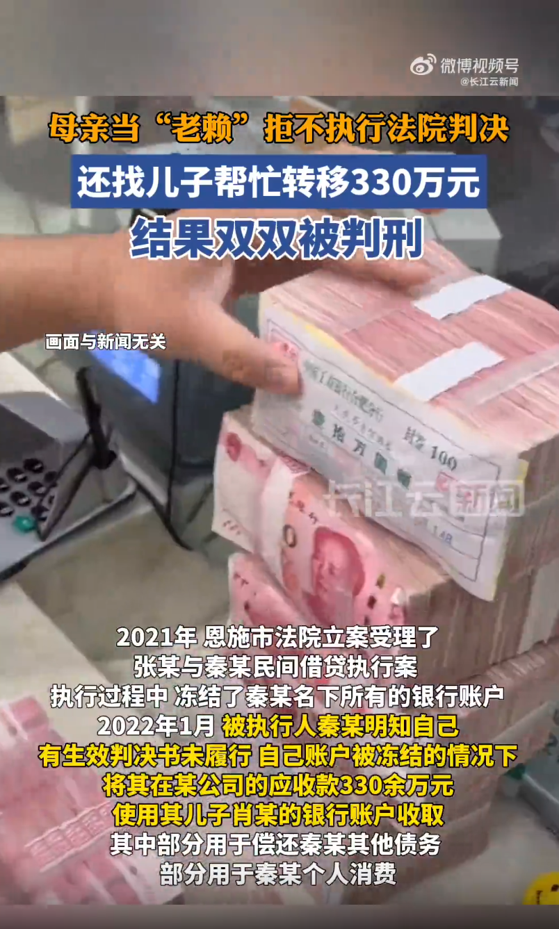 近日,湖北恩施人民法院审结一起拒不执行判决,裁定罪案件女子秦某及其儿子肖某同时被判刑。