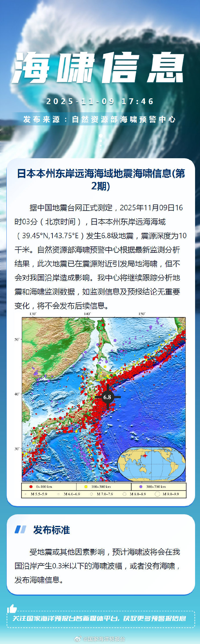 中国地震台网正式测定:11月09日16时03分在日本本州东部远海(北纬39.45度,东经143.75度)发生6.8级地震,震源深度10千米。