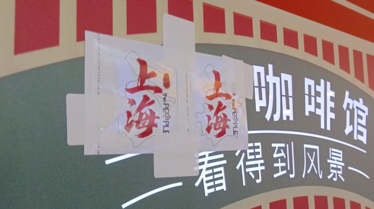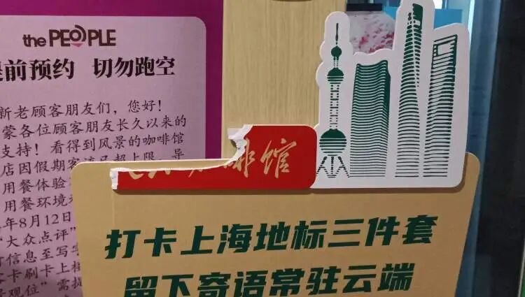 记者注意到,该店近日已经对“人民咖啡馆”的名称露出做了处理,显示屏已经看不到“人民咖啡馆”的名称。店内多处宣传物料上的“人民咖啡馆”字样有明显的人为的处理痕迹,有的只剩下“咖啡馆”,有的只剩下“馆”,还有一处宣传品上的“人民”被黏贴了“上海”两字,遮挡意图非常明显。