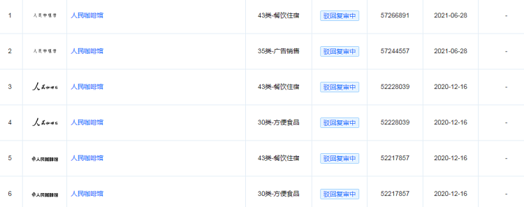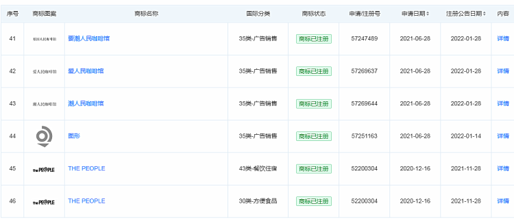 天眼查显示,要潮文化近年来有过高达九十多次的商标申请记录,申请动作频频。其中已经注册商标46项,中文商标包括要潮、爱人民咖啡馆、潮人民咖啡馆、要潮人民咖啡馆等,英文商标包括THE PEOPLE的多个类别,而“人民咖啡馆”的35类(广告销售)和43类(餐饮住宿)显示为商标无效。有6条“人民咖啡馆”的商标申请为驳回复审,这些商标采用了不同的“人民咖啡馆”字体。