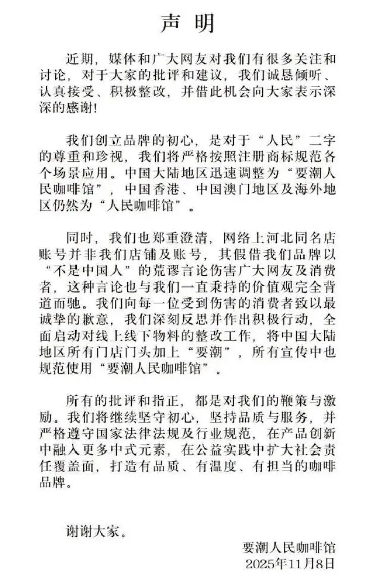 据了解,人民咖啡馆已陆续在全国开设二十多家直营门店,其母公司为要潮(上海)文化传播有限公司(以下简称要潮文化)。11月8日,要潮文化在社交平台发布声明表示,公司将严格按照注册商标规范各个场景应用。中国内地迅速调整为“要潮人民咖啡馆”,中国香港、中国澳门地区及海外地区仍然为“人民咖啡馆”。公司全面启动对线上线下物料的整改工作,将中国大陆所有门店门头加上“要潮”,所有宣传中也规范使用“要潮人民咖啡馆”。