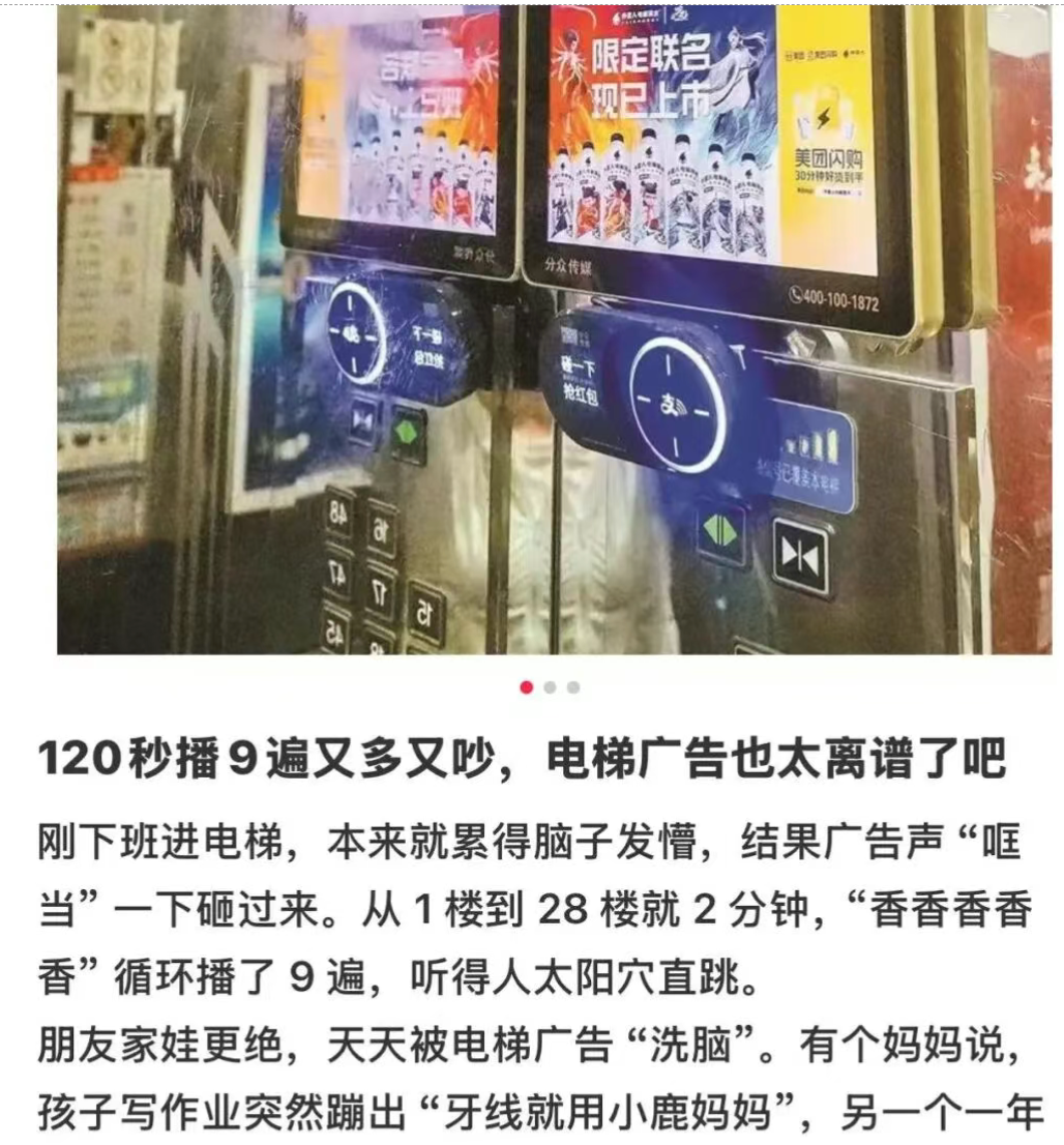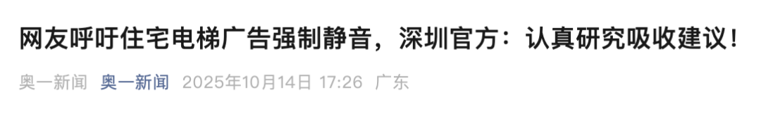 事实上,很多人苦电梯广告久矣。近日,有深圳网友呼吁住宅电梯广告强制静音,得到官方回复。