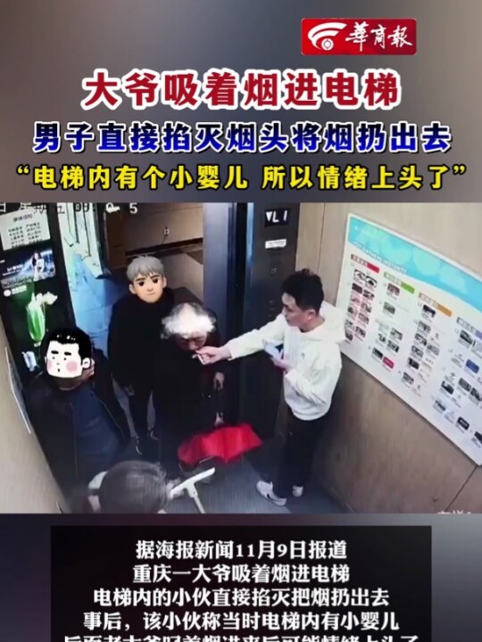 11月7日,重庆一小区电梯内,一位大爷叼着点燃的香烟进入电梯。此时电梯中已有乘客,包括一位阿姨推着婴儿车。同乘年轻男子司先生见状,迅速伸手掐灭烟头并扔出电梯外。