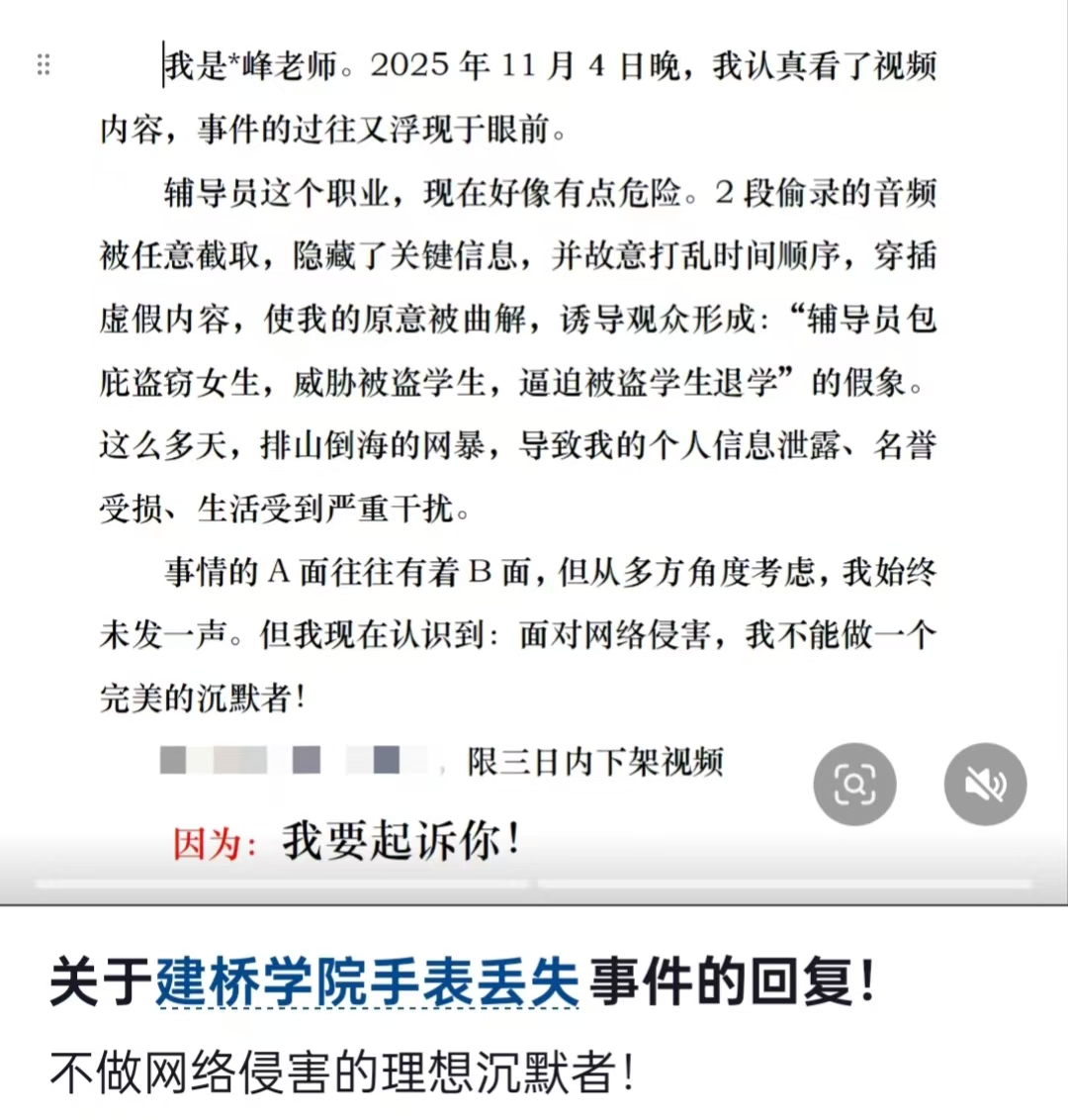 此外,网上亦流传出一段自称学生辅导员的回复,回复称学生发布的内容存在“隐藏关键信息”“打乱时间顺序”“穿插虚假内容”等内容,并对自己造成网暴,自己下一步将起诉。