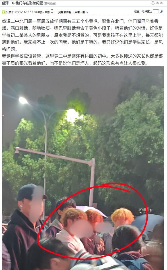 涉事学校是吴江区盛泽二中,是一所公办初中。网友介绍,这些青年放学期间聚集在学校北门,每天接送孩子上学都能看到,“这形象让人很难受,学校应该管管,毕竟二中是有排面的初中。”图片显示,有3个黄头发的男子站在人群中。