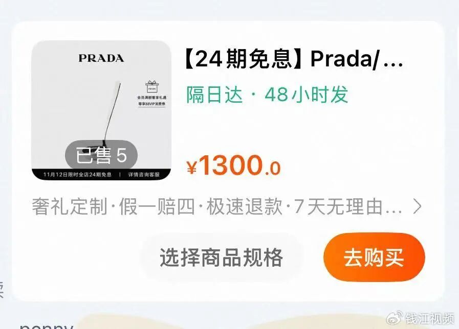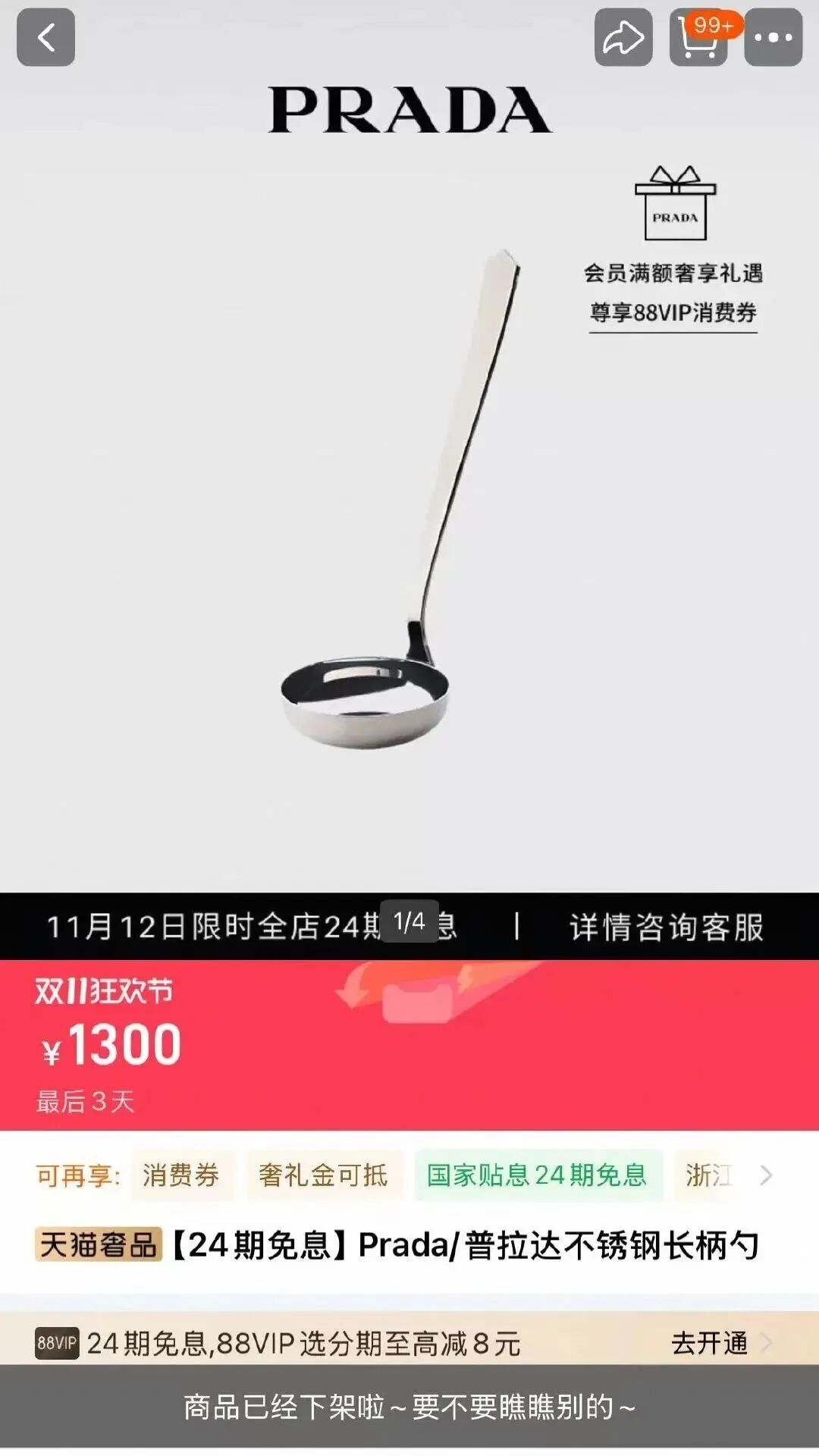 11月12日下午,记者记者在电商平台旗舰店发现了这款勺子,全名叫“Prada/普拉达不锈钢长柄勺”,售价确为1300元,可24期免息购买,销量显示为5。