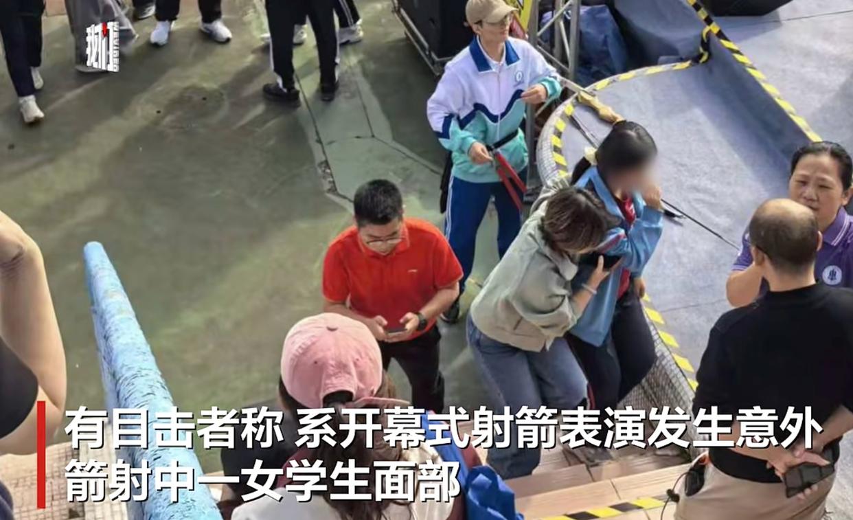 有目击者称,系开幕式射箭表演发生意外,箭射中一女学生面部。