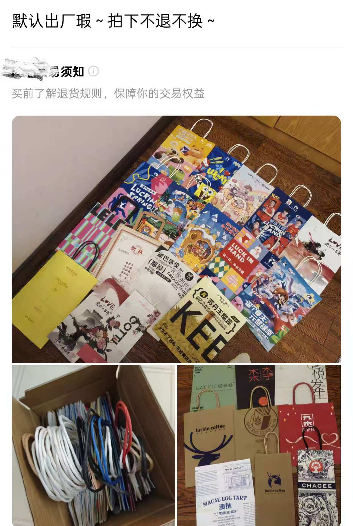 在部分交易平台,出现以“牛皮纸袋合集”为标题的系列产品整合,其中产品多为品牌奶茶袋,此外还有网友询问是否可回收袋子。