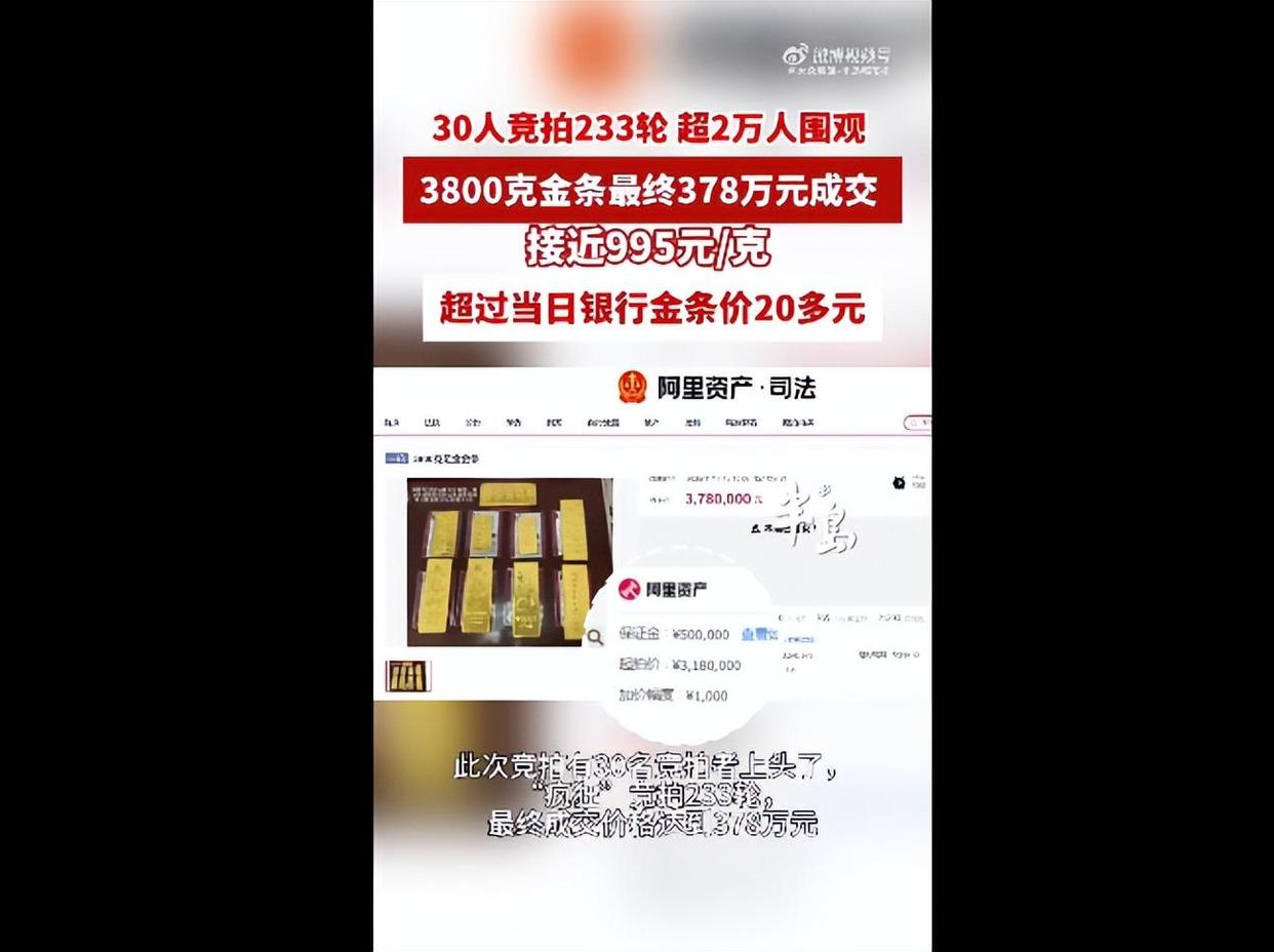 据大众新闻-半岛都市报报道,11月14日,海南省二中院拍卖的3800克足金金条以378万元成交。此次竞拍有超过2.1万人围观,765人设置提醒,30名竞拍者上头“疯狂”竞拍233轮,最终成交价格达到378万元,成交单价接近995元每克,超过当日银行金条价格20多元。