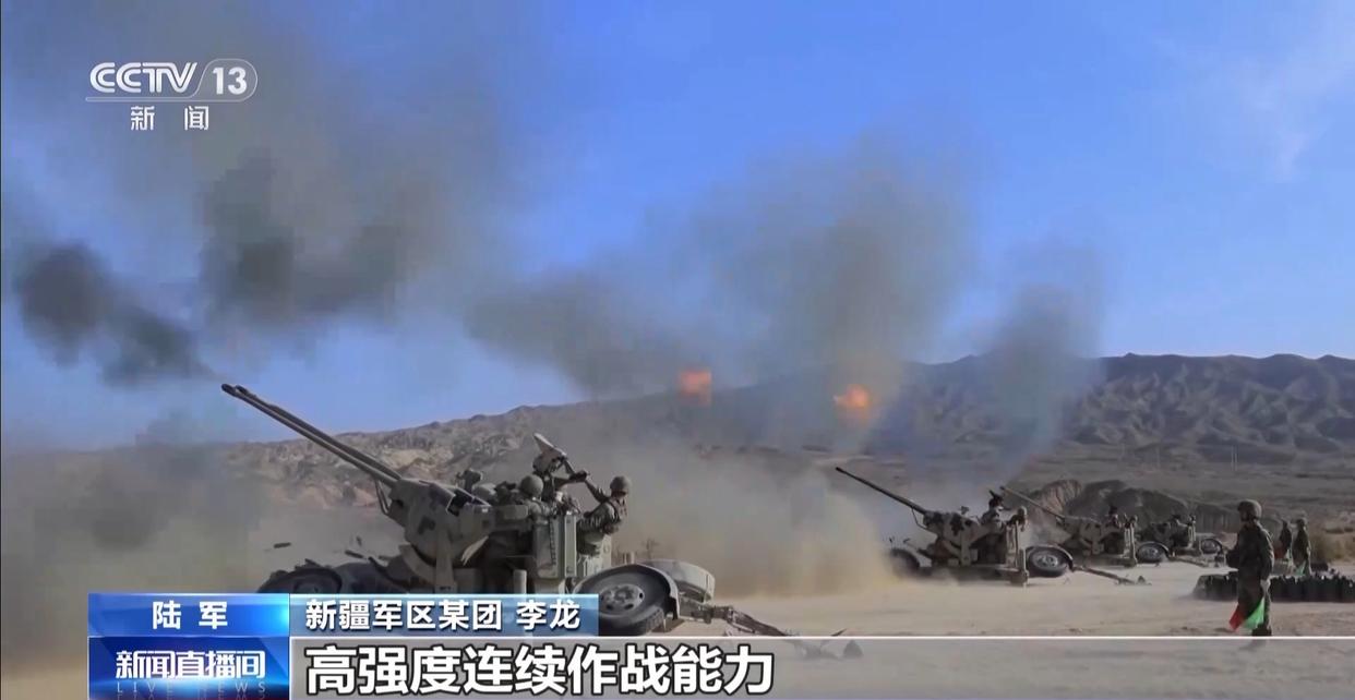 近日,新疆军区某高炮分队在大漠戈壁组织跨昼夜、高强度实兵实弹射击演练。