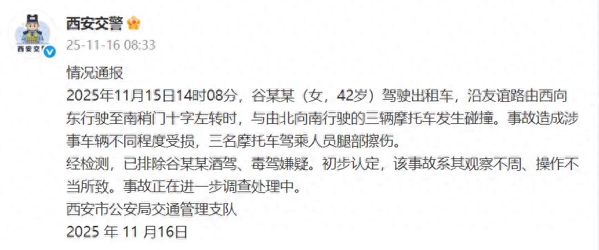 2025年11月15日14时08分,谷某某(女,42岁)驾驶出租车,沿友谊路由西向东行驶至南稍门十字左转时,与由北向南行驶的三辆摩托车发生碰撞。事故造成涉事车辆不同程度受损,三名摩托车驾乘人员腿部擦伤。
