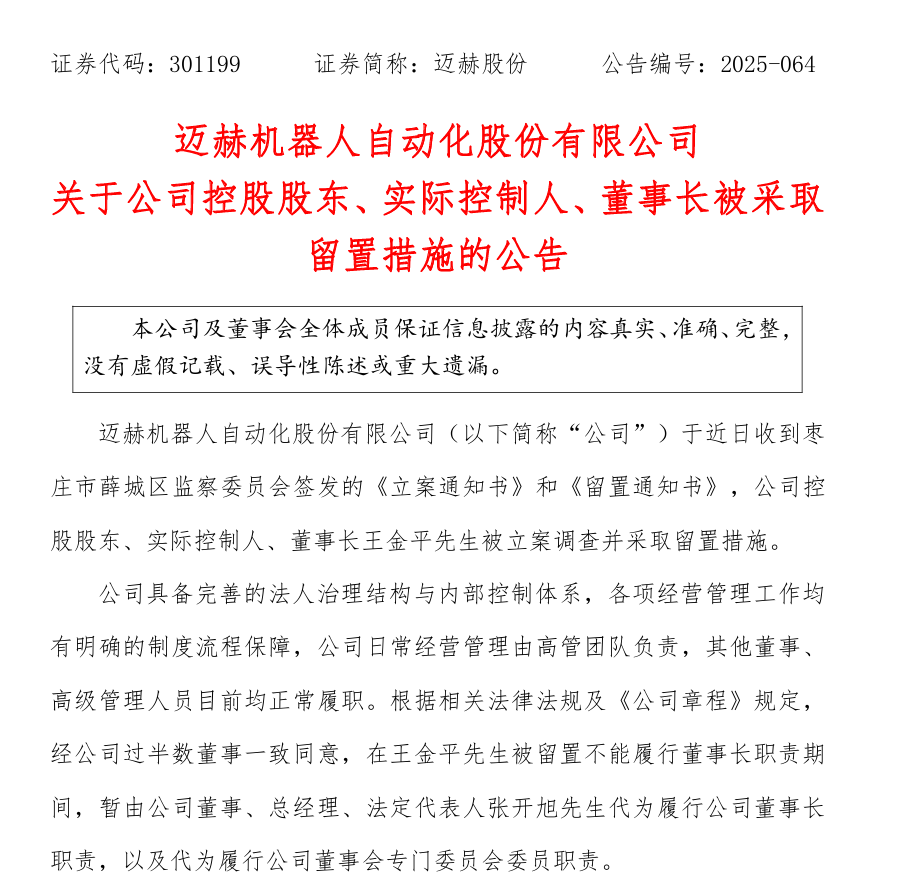 迈赫股份(301199)11月16日晚公告称,公司于近日收到枣庄市薛城区监察委员会签发的《立案通知书》和《留置通知书》,公司控股股东、实际控制人、董事长王金平被立案调查并采取留置措施。