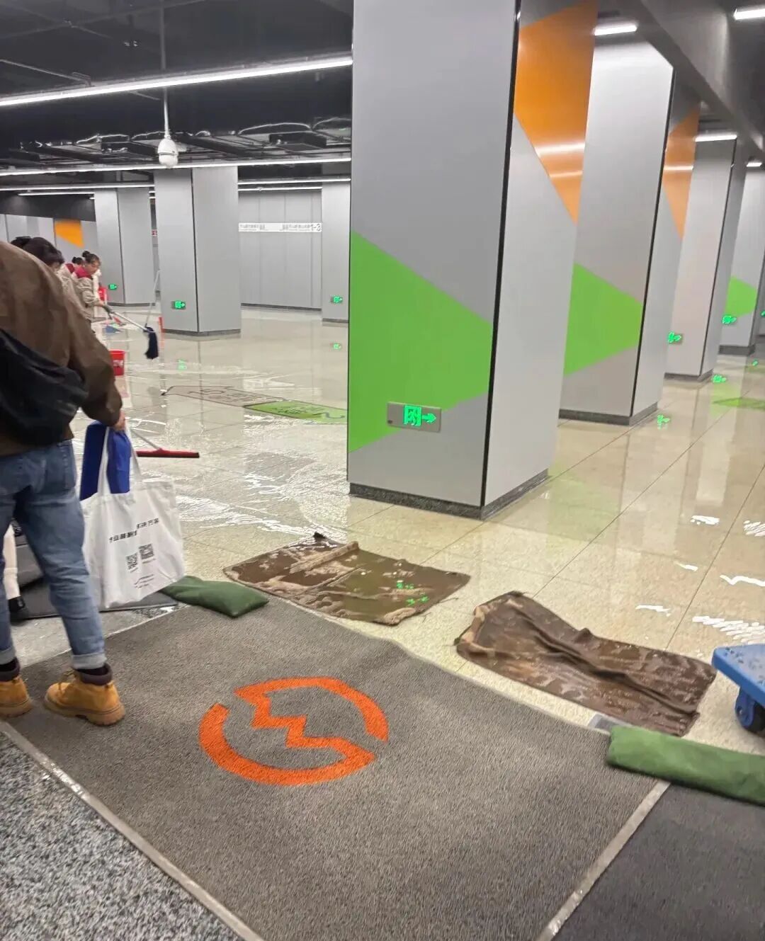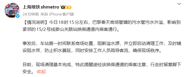 事发后,车站第一时间联系商场处置,阻断溢水源,并立即启动清理工作,及时铺设阻水带,防止积水蔓延,同时安排工作人员疏导客流,确保现场秩序。目前,现场清理基本完成,特此提醒途经该换乘通道的乘客注意,行走时留意脚下安全。