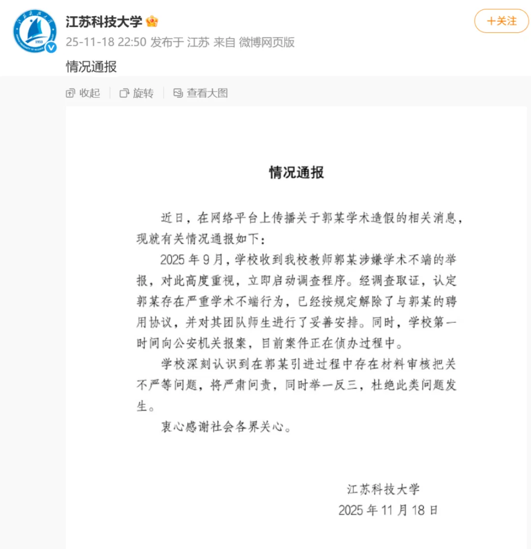 2025年9月,学校收到我校教师郭某涉嫌学术不端的举报,对此高度重视,立即启动调查程序。经调查取证,认定郭某存在严重学术不端行为,已经按规定解除了与郭某的聘用协议,并对其团队师生进行了妥善安排。同时,学校第一时间向公安机关报案,目前案件正在侦办过程中。