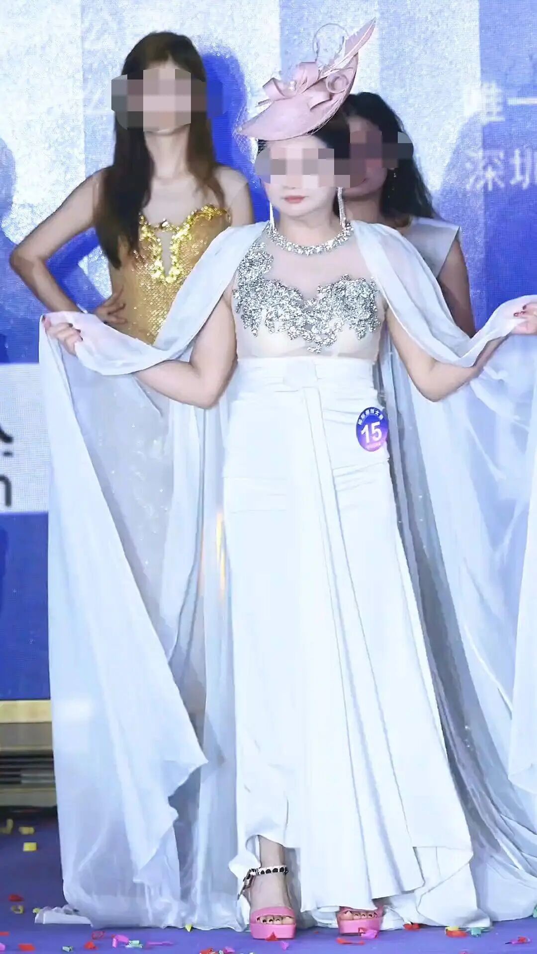 网络流传的相关视频显示,15号女选手是一位看起来年龄偏大的女士,头戴桂冠、身披冠军绶带、手拿冠军证书,在强光下独自走上T台,向观众与评委致谢。她的体态丰腴,步伐略显拘谨,但脸上写满了自信和骄傲。