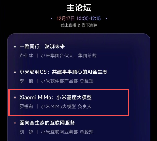 日程表上显示,小米集团合伙人、集团总裁卢伟冰等人将在主论坛发言,刚刚加入小米的罗福莉也将进行首秀,日程表显示,其职位为MiMo大模型负责人。