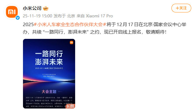 小米公司今日官宣,2025 小米“人车家全生态”合作伙伴大会将于12 月17日在北京・国家会议中心举办。